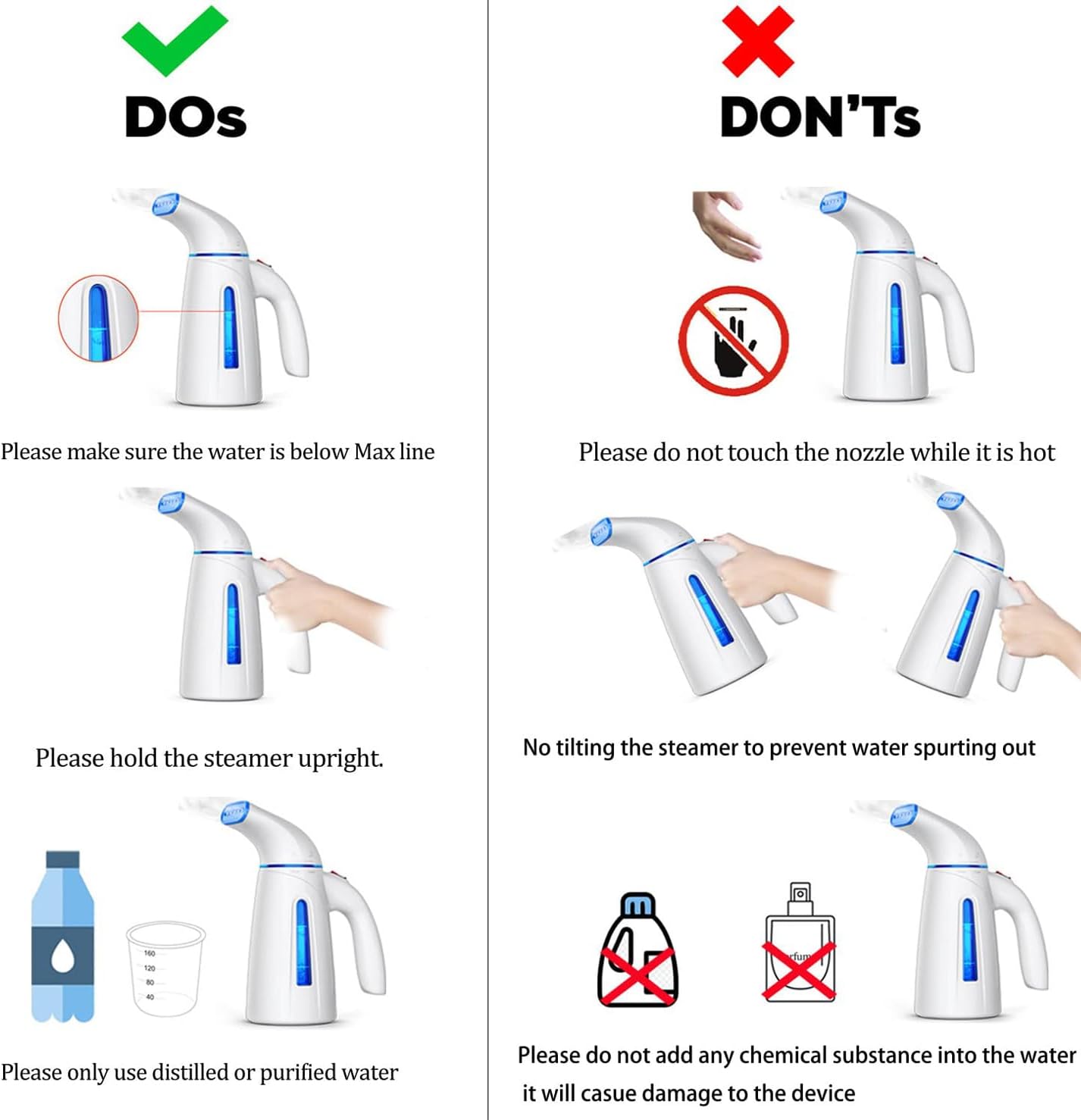 Water spurting usually happens for a few reasons: the water level is above the MAX line, you're tilting the steamer instead of holding it upright, you're using tap water with mineral buildup, or there's residue in the tank. Always use distilled or purified water, hold the steamer upright during use, and fill below the MAX line. If spurting continues, clean the water tank with a vinegar solution (8:2 water to vinegar ratio) or lemon water (7:3 ratio), boil it, then dump it out.