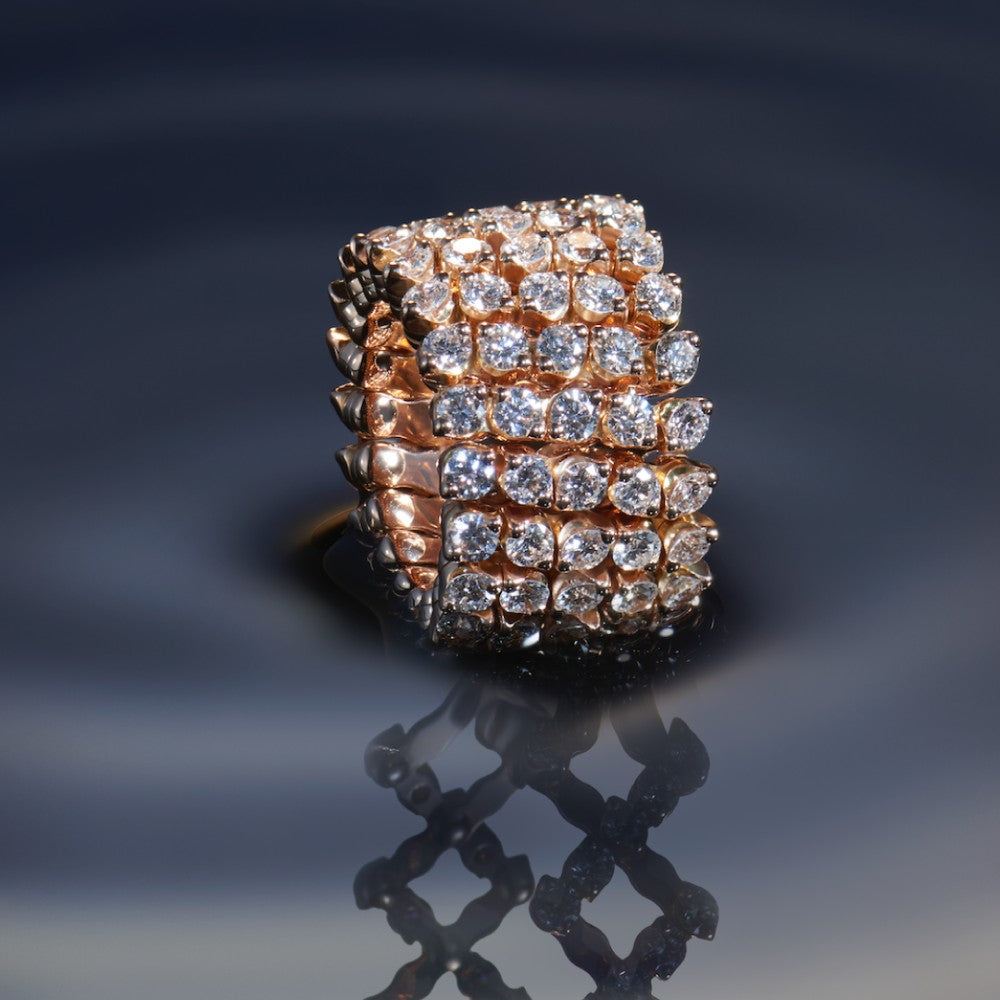 The patented multi-size rings are true masters of transformation. The combination of traditional Italian jewelry craftsmanship and advanced engineering has resulted in rings that can be easily resized. These versatile pieces of jewelry also impress with their outstanding quality and the use of only the finest materials. Whether as a wide ring on the ring finger or as an eye-catcher on the index finger, these versatile pieces of jewelry made from the finest materials can be transformed in seconds. The ring shown is made of 750/- rose gold and is set halfway down the center with brilliant-cut diamonds.